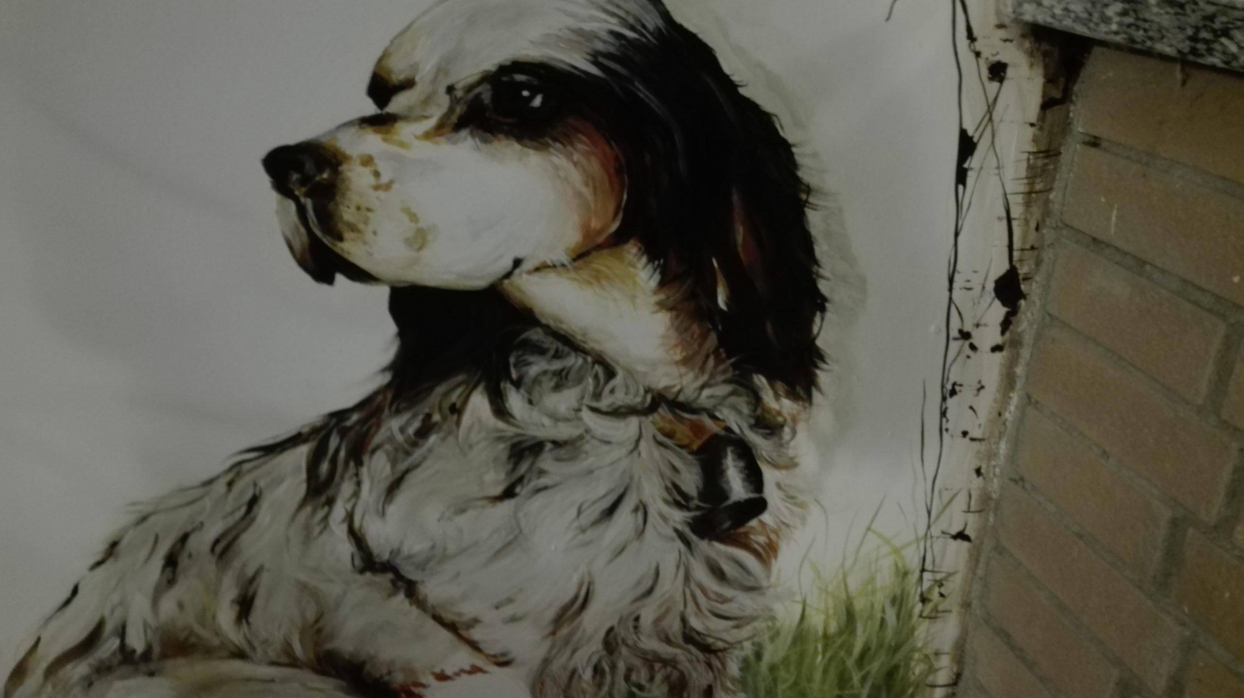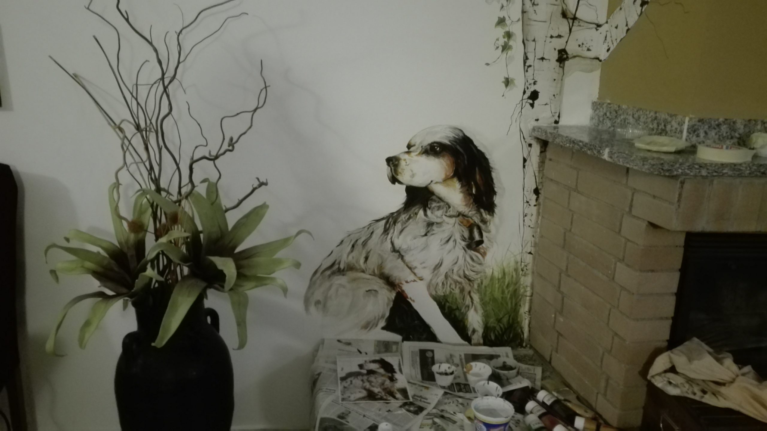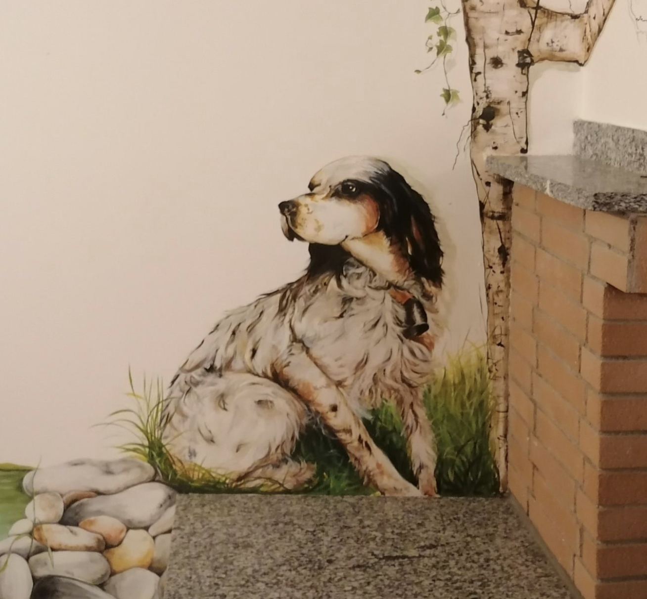 Setter inglese camino:In questo caso ho riprodotto l’immagine di un cane e, per poterlo ingrandire, mi sono servita di una griglia di riferimento, disegnandola prima sull’immagine in piccolo e successivamente sul muro, ingrandendola. Anche in questo caso ho utilizzato acrilici e fissativo finale.