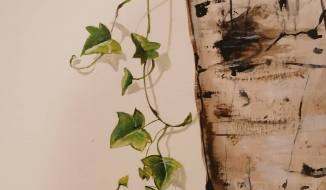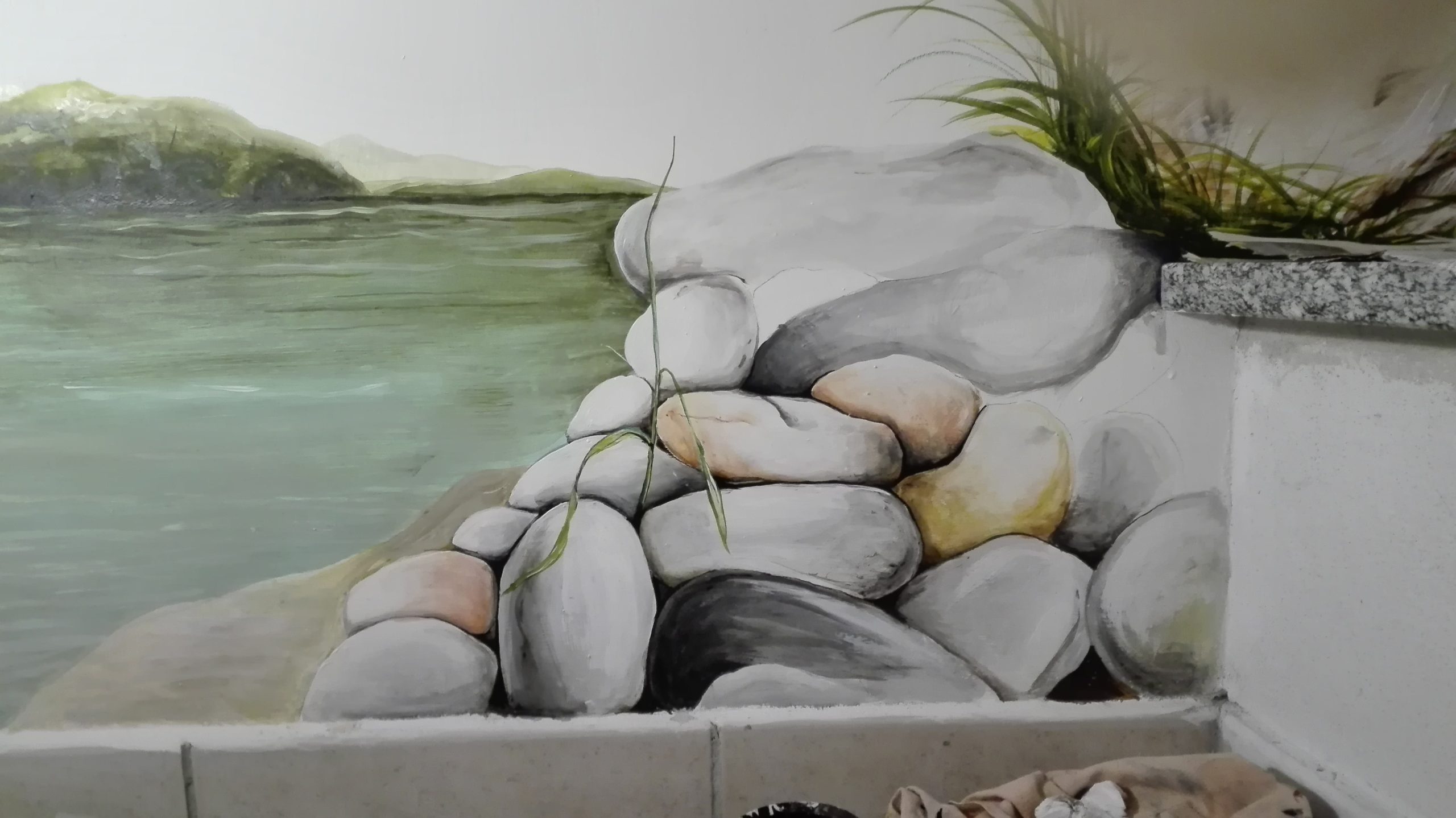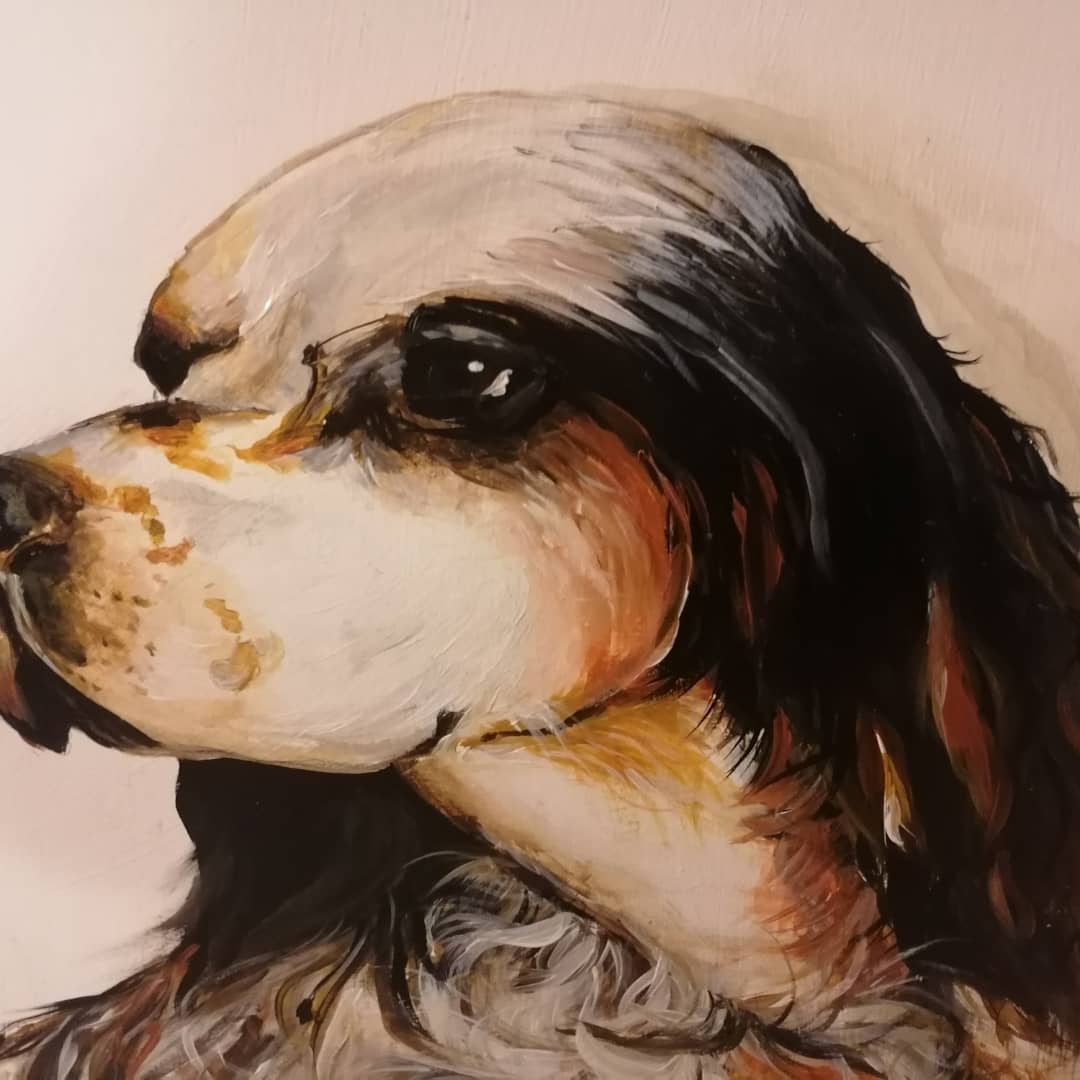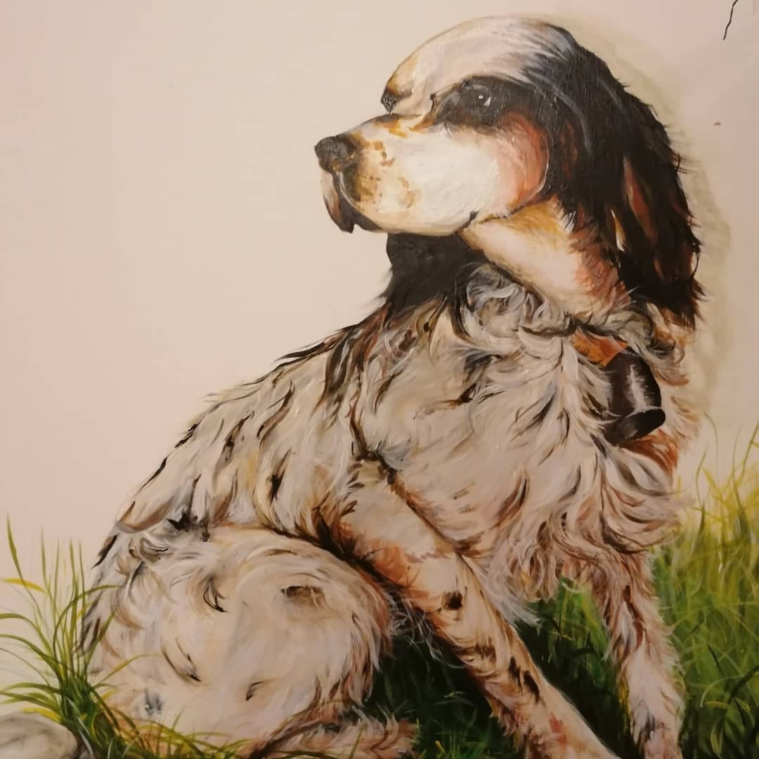 Setter inglese camino:In questo caso ho riprodotto l’immagine di un cane e, per poterlo ingrandire, mi sono servita di una griglia di riferimento, disegnandola prima sull’immagine in piccolo e successivamente sul muro, ingrandendola. Anche in questo caso ho utilizzato acrilici e fissativo finale.